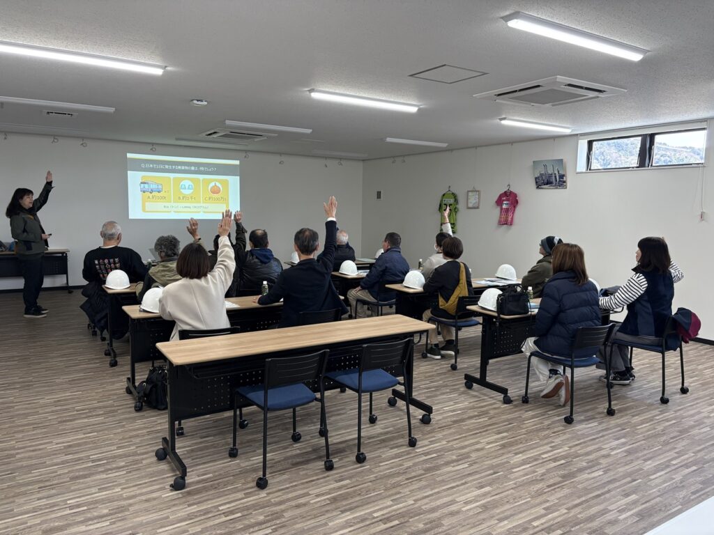説明の途中では、リサイクルに関するクイズを実施しました。参加者の皆さまが声をそろえて答える場面もあり、現場見学前から和やかな雰囲気で時間を過ごすことができました。